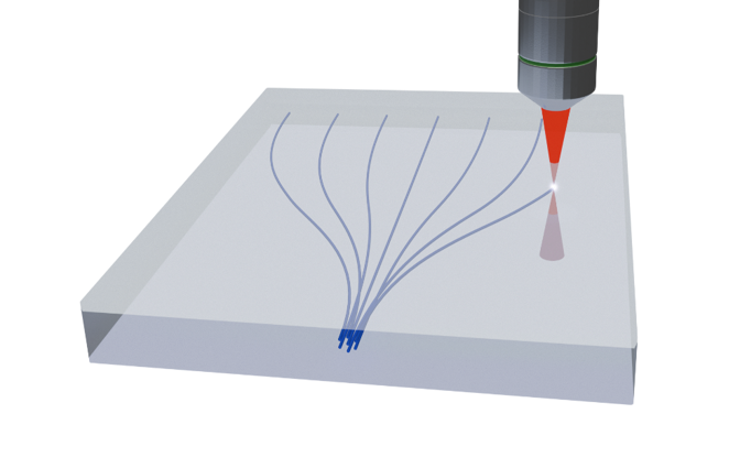 激光直寫3D波導(dǎo)技術(shù)利用自開發(fā)的飛秒激光直寫設(shè)備,通過精確控制激光在玻璃基材上的寫入,實現(xiàn)高精度的三維波導(dǎo)結(jié)構(gòu)。該技術(shù)具有低損耗、高密度、精細(xì)加工的優(yōu)勢,能夠在微米級別上精確調(diào)控光的傳播路徑,廣泛應(yīng)用于光學(xué)通信、傳感器和光電集成等領(lǐng)域,推動光通信器件和模塊的創(chuàng)新與發(fā)展。